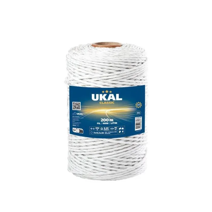 Žica za pašnjak UKAL CLASSIC je kvalitetna žica za električne ograde. Opremljena je s vodičima od nehrđajućeg čelika promjera 0,2 mm.
